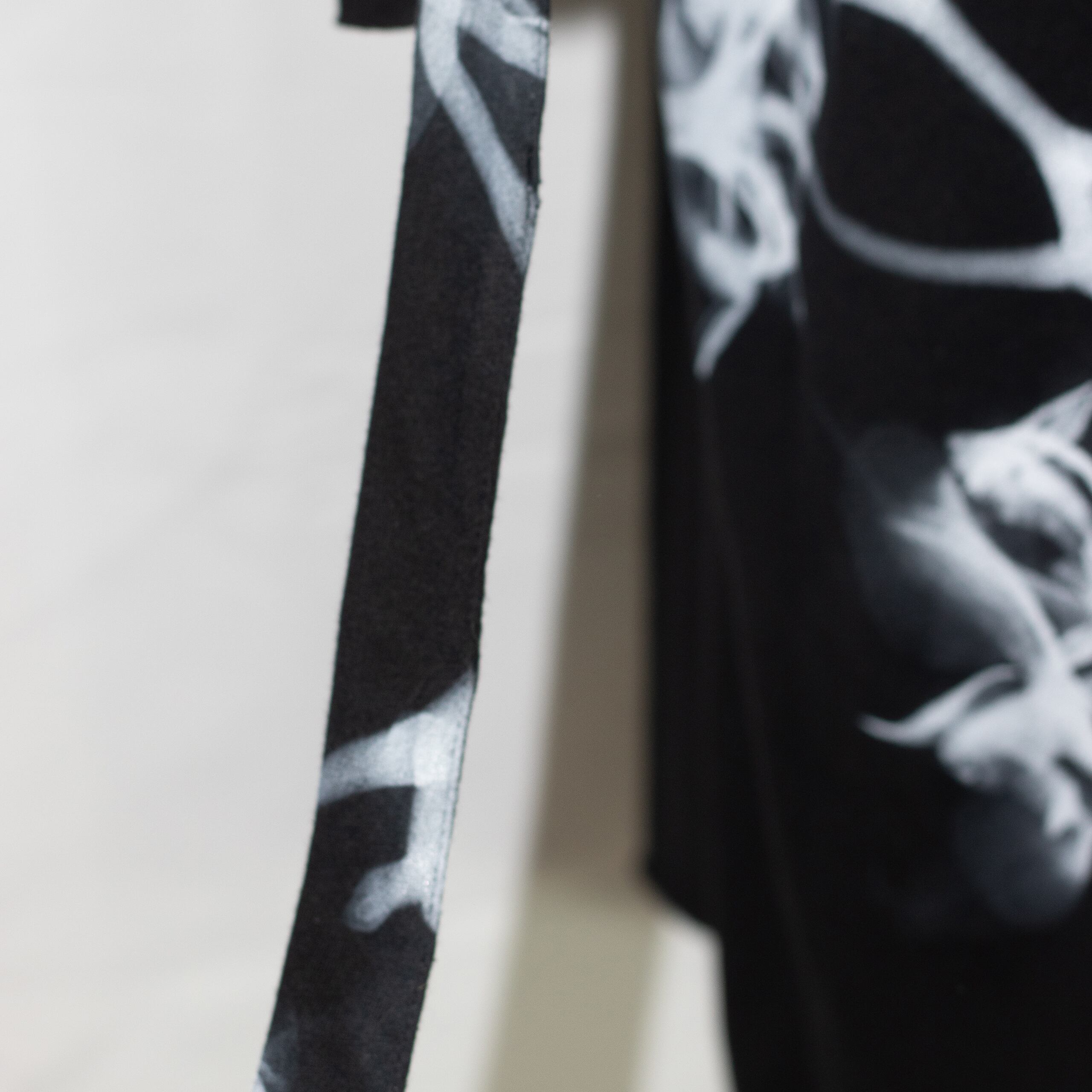 ウエストから同生地の紐が縫い付けてあり、後で絞ったり、前で結んだり、垂らしたりと遊べる仕様になっております。